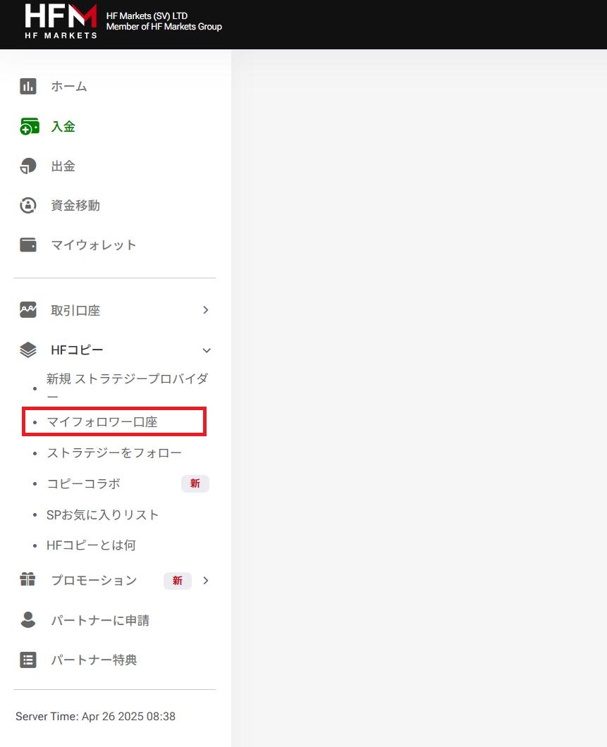 HFコピーをクリックして、マイフォロワー口座をクリックしてください。