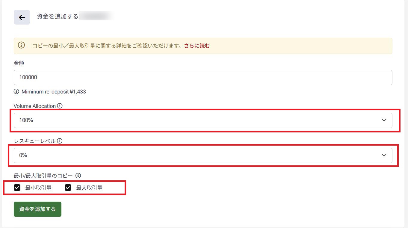Copy minimum/maximum volumes:最小取引量 / 最大取引量どちらもチェックあり