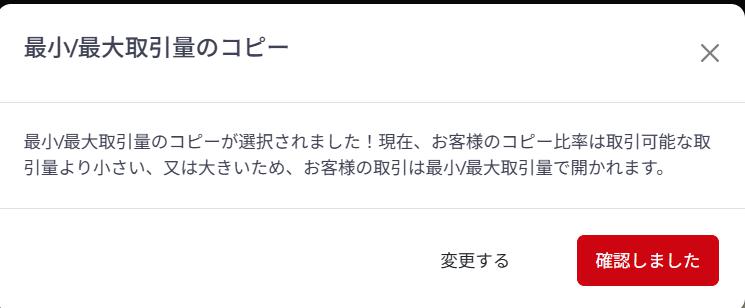 最小/最大取引コピー:最小取引量 / 最大取引量どちらにもチェック